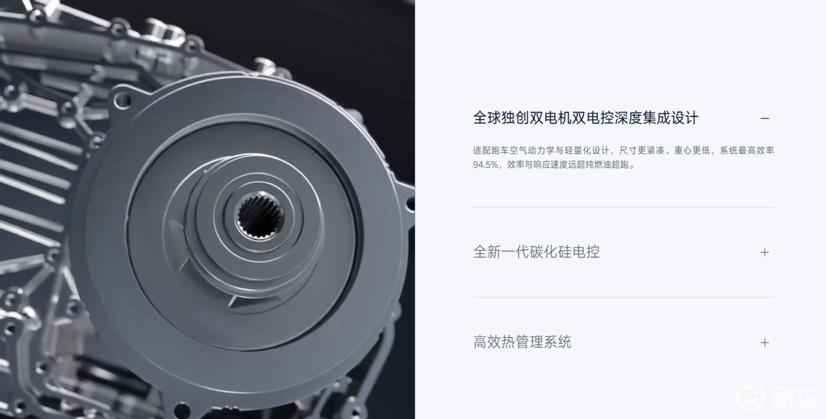 车辆的动力系统尤为出色。易四方系统是全球首个基于30000转高性能电机的四电机平台,每个电机的峰值功率高达555kW,系统为整车共提供超3000Ps综合马力。