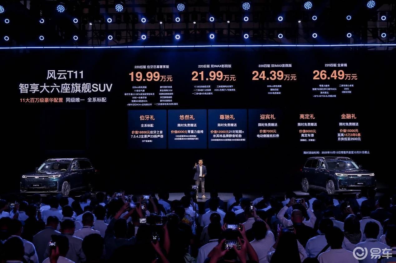 风云T11已正式开启预售,共推出4款版型,其中220后驱伯牙巨幕奢享版预售价19.99万元;220后驱双iMax影院版预售价21.99万元;220四驱双IMAX影院版预售价24.39万元 ;220四驱全家桶预售价26.49万元。同时,发布会现场公布了以下多重极具诚意的预售权益,为用户带来“一步到位”的豪华拥车体验。