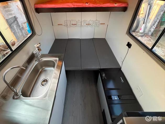 货车改装成房车,升降顶设计,轻松应对限高问题 2025-10-29 4255阅读 这是一台单排两座的燃油版小货车,后轮采用双胎设计,承载力更强。房箱是根据后斗的尺寸定制的。 制作好的房箱重量较大,人工搬运会非常费力,因此使用叉车搬运更为简便。 房箱放置好后,可以关闭左右栏板,轻轻一推即可升起顶棚,室内空间显著增大。 箱门位于尾部是背驮式房箱的常见布局,但将房箱门设计成露台的形式较为罕见,需要外置梯子辅助进入。 室内设计简洁实用,左侧为微厨区,打开窗户即可烹饪,右侧为储物空间,内置驻车电源,解决日常用电问题。中间是卡座和组合床,通常作为客厅使用,人多时可组合成横床。