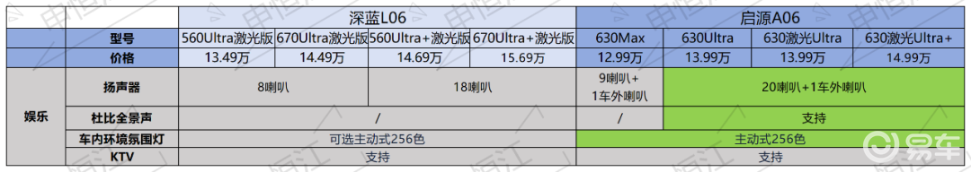 扬声器喇叭数量,启源比深蓝多一两个,同时还多了一个车外喇叭,中高顶配还支持杜比全景声。氛围灯颜色,双方都是主动式256色(深蓝是赠送),支持KTV。