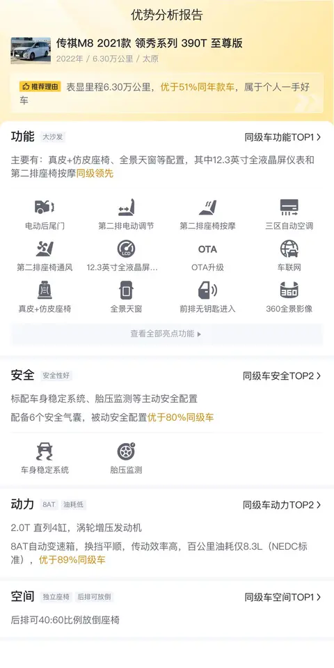 根据懂车帝大数据分析,该车的市场行情基本符合全国同款车型的二手车平均价格。从近期成交量来看,该车在全国同款二手车型中销量排名较为靠前。此外,该车的热度值也较高,说明它受到了消费者的关注和喜爱。作为一款中大型MPV,传祺M8在市场上的表现一直都不错。它凭借着出色的性价比、丰富的配置以及宽敞的空间,赢得了不少消费者的青睐。在二手车市场上,传祺M8同样具有较高的竞争力。根据懂车帝的数据分析,这款传祺M8 2021款领秀系列390T至尊版在以下几个方面具有比较优势:首先,它的行驶里程相对较短,仅为6.30万公里,这表明车辆的使用程度不高,还有较大的使用寿命。其次,该车的外观和内饰状况良好,未发现明显受损情况,这有助于提高车辆的保值率。再次,该车的配置丰富,包括L2级辅助驾驶、360全景影像、全速自适应巡航等多项实用功能,提升了驾乘的舒适性和安全性。最后,该车的空间表现优秀,宽敞的内部空间和舒适的座椅设计,为乘客提供了良好的乘坐体验。综合来看,这款传祺M8 2021款领秀系列390T至尊版在二手车市场上具有较高的竞争力和性价比,是一款值得消费者考虑的车型。