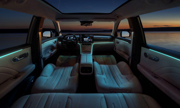 再来看一下座舱布局,内饰随处可见软包用料质感满满,设计风格呈简约风格,展翼式的IP台错落有致,配有大屏,中控出风口和无线充电,杯槽和手扶箱,32色氛围灯,二排提供小桌板,座舱配色提供三种配色选择。
