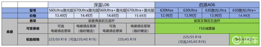 接下来将会从十三个维度进行对比,因为启源这边配置太多了,就把510版本删除,拿630版本跟深蓝对比。