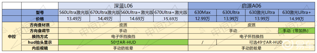 都是皮质方向盘,都是手动调节,只有启源顶配带有加热功能。电子怀挡换挡,手动防眩晕内后视镜。深蓝HUD是标配50寸ARHUD,而启源这边低配是没有,中高顶配是选配,49寸ARHUD。