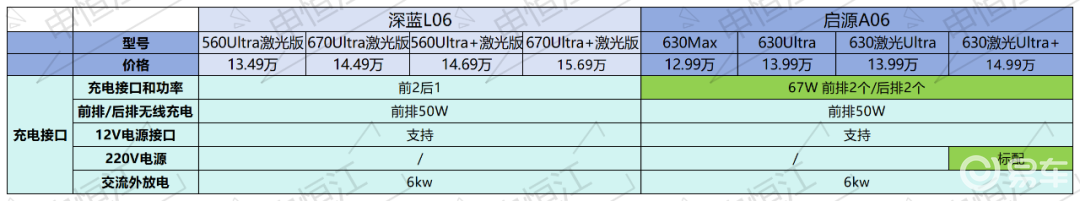 充电接口方面来说,启源更好,有个最大功率为67瓦,而深蓝没有,甚至后排充电口还比启源少一个。都支持前排50瓦无线充电,均支持12V电源接口,启源顶配支持220V,外放电功率都是6kw。