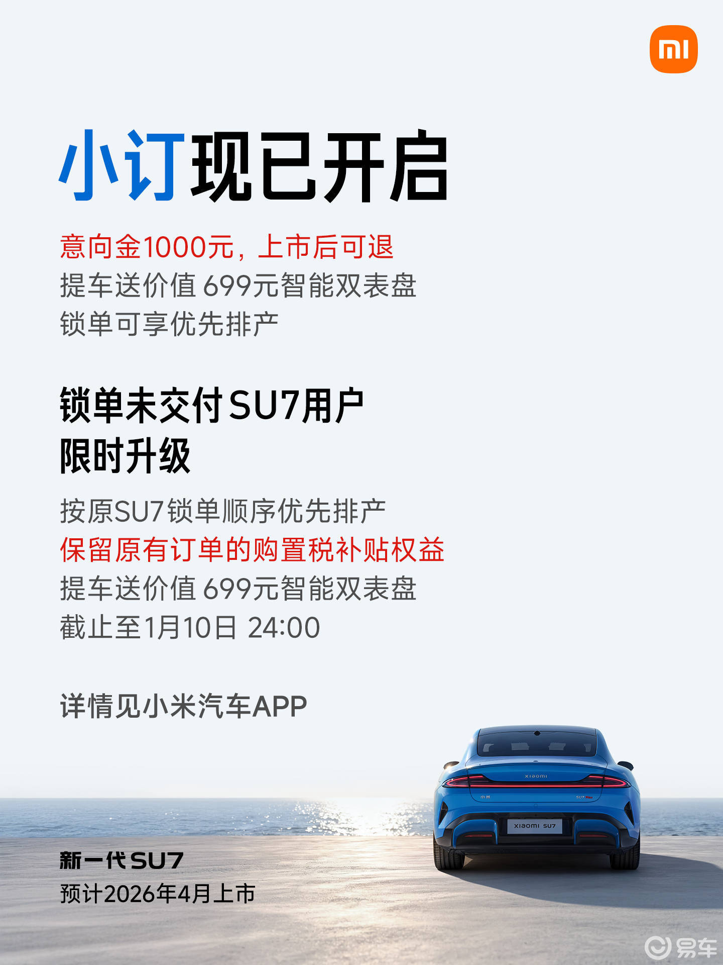 关于小定权益,销售表示,支付小定后即可进入交付排队序列,享有优先提车权,但小定若要取消,须等到4月正式上市后才行。销售特别提醒,小定截止时间为1月10日。此外,小定用户还可获赠699元的双表盘配件。对于老款车型,销售称目前小米汽车官方小程序已下架老款SU7的下定入口,老款大概率将停产。尚未提车的老款订单用户,可直接转为新款SU7,仅需补足差价,但下定YU7的用户无法转订新款SU7。