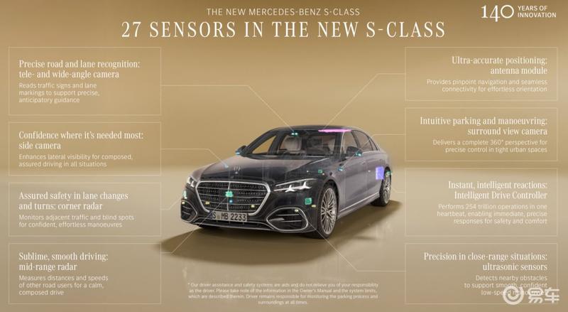 安全性方面新车同样实现了全面进阶。新车标配前排座椅PRE-SAFE预紧式安全带和双级限力器、驾驶员和乘客安全气囊的两级点爆功能,以及乘客安全气囊中的主动排气装置。最高提供15个安全气囊,在此基础上,2个PRE-SAFE侧碰保护气囊及2个后排安全带气囊。安全气囊控制单元会计算在特定情况下哪些气囊可能发挥作用,并且只会展开必要的气囊,让约束保护系统的作用更有针对性。